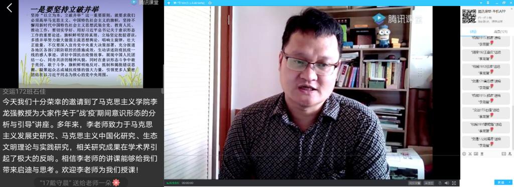 讲座开始,李龙强老师将疫情时政与思政理论深度融合,用大量的事例回顾了疫情爆发以来舆论斗争的焦点,深刻剖析面对这场新中国成立以来,传播速度最快、感染范围最广、防控难度最大的重大突发公共卫生事件做好思想政治引领工作的必要性。随后,李老师从坚持立破并举、做到疏堵结合、抓住关键少数、加强阵地建设、注重能力提高等七个方面进行指导,引导正确舆论导向,宣传党中央重大决策部署和人民战疫的措施成效,讲述防疫抗疫一线的感人事迹,讲清中国抗击疫情故事。讲座后学生们反响积极纷纷表示,作为新时代青年大学生在疫情防控中,不单要物理防护阻断病毒传播,更不可忽视精神防护筑牢思想阵地。