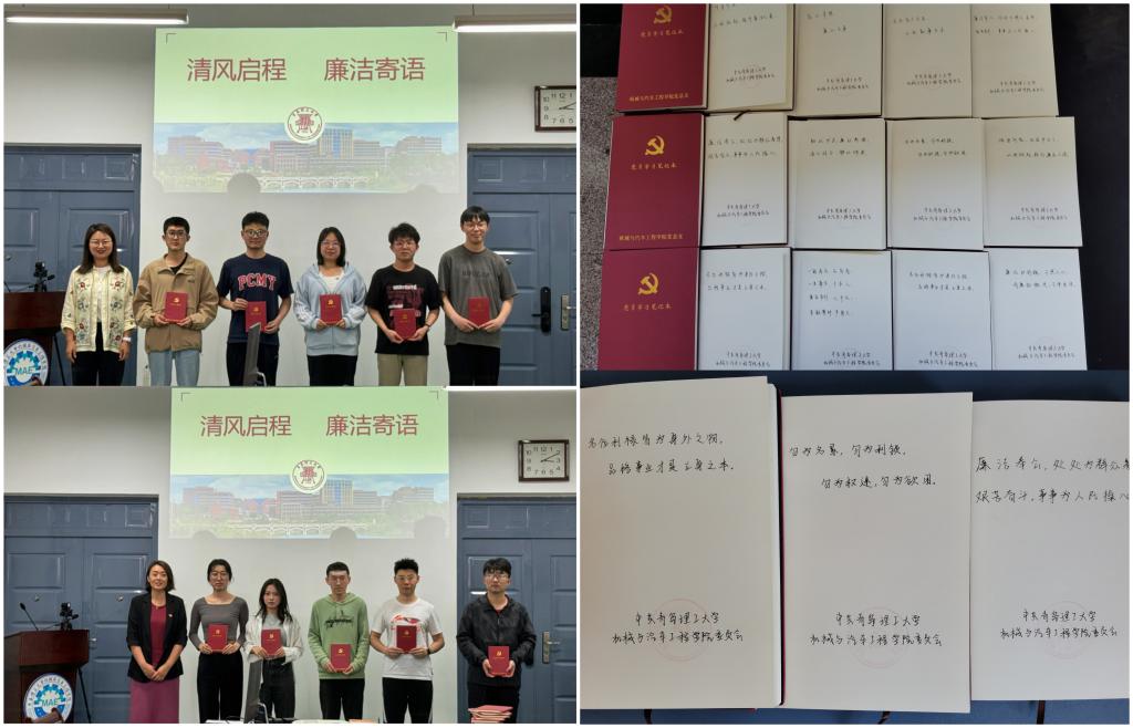 学院组织各支部书记为毕业生党员在笔记本上书写廉洁寄语,并将写有廉洁寄语的笔记本亲自赠送给每一位毕业生党员,希望大家带着这份嘱托和期待,走向新的征程,在面对未来纷繁复杂的社会环境时,仍能秉持初心,如水廉洁,如山清正。