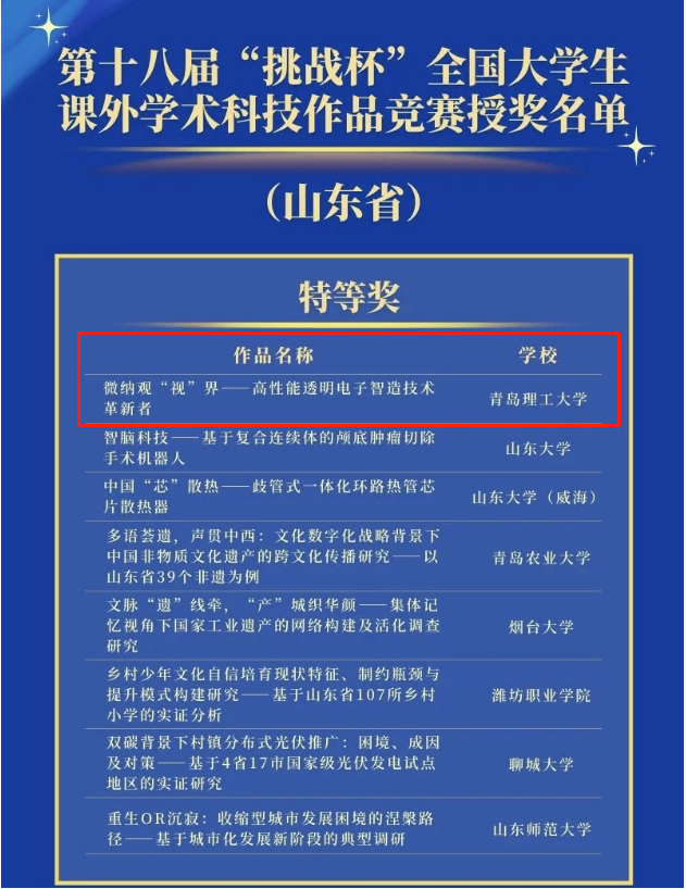 10月30日,第十八届“挑战杯”全国大学生课外学术科技作品竞赛在贵州大学落下帷幕,经过激烈角逐,jinnianhui今年会参赛项目《微纳观“视”界——高性能透明电子智造技术革新者》(指导教师:朱晓阳、兰红波、杨建军;团队成员:王瑞、周君仪、段培开、张友超、商帅、台玉平、于志浩、张金宝)勇夺主体赛全国特等奖,创造了今年会官网在此项竞赛中首次获特等奖记录。此项成绩也是今年会官方网站在“挑战杯”系列竞赛中的最好成绩,实现了赛事重大突破。