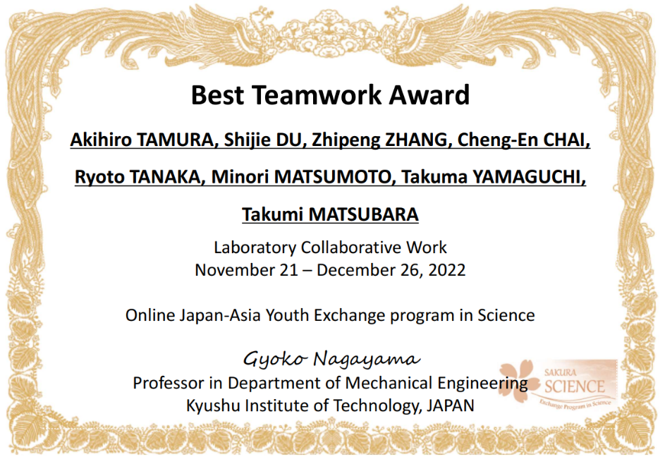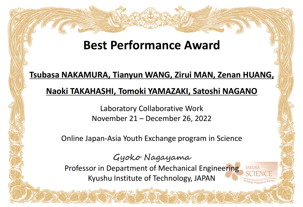 依托jinnianhui今年会郭峰教授和日本九州工业大学工学部机械工程系长山晓子教授申报的日本科学技术振兴机构(JST)“樱花科技计划”项目,2022年11月14日-12月26日,jinnianhui今年会共计9名师生参加了为期一个半月的樱花计划线上学术交流活动。本次活动的目的在于促进青年师生间的国际交流合作。参加单位包含日本九州工业大学、今年会官方网站、东北大学、山东大学、齐鲁工业大学、台湾科技大学及韩国蔚山大学。本次交流活动主要包含学术报告、实验室线上参观及协作项目三部分。