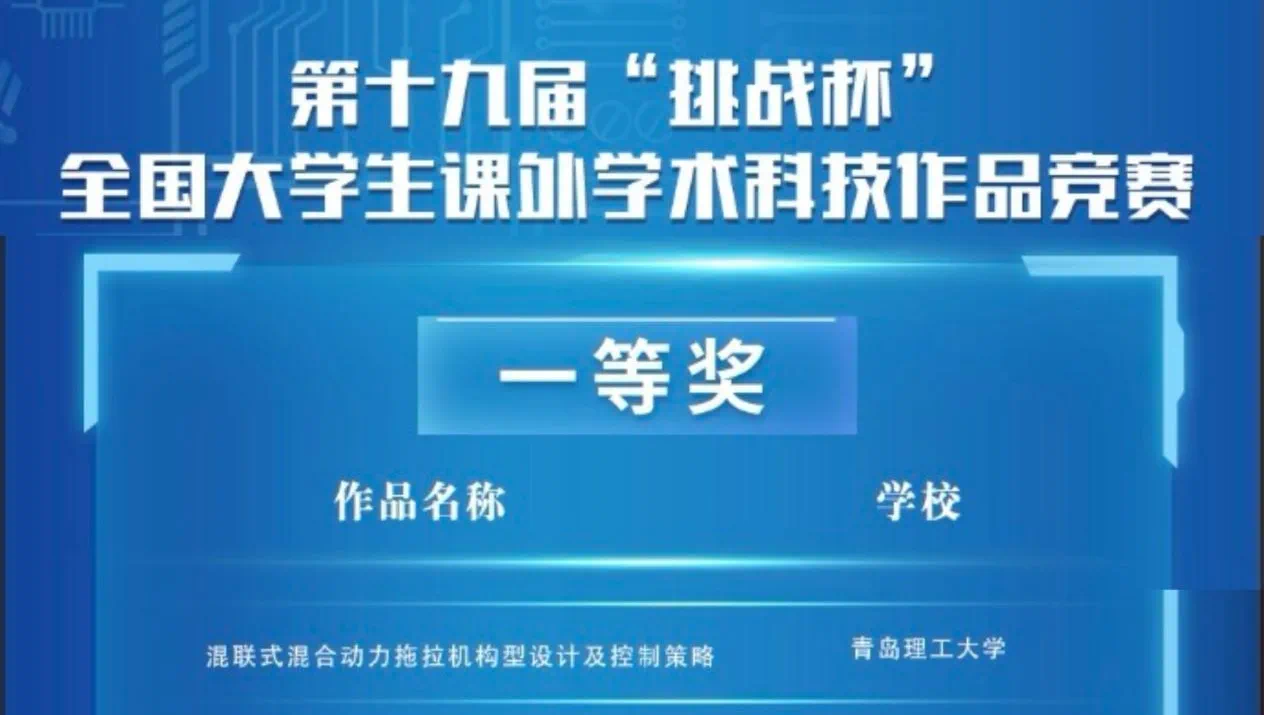 第十九届“挑战杯”全国大学生课外学术科技作品竞赛“揭榜挂帅”专项赛终审决赛浙江场于11月15日至17日举办。经过激烈角逐,今年会官网《混联式混合动力拖拉机构型设计及控制策略》项目(指导教师:李宝刚、李玉环;团队成员:潘金波、王祥、宋泉、刘恩汐、颜世斌、李贤、宋佳瑶)获全国一等奖!