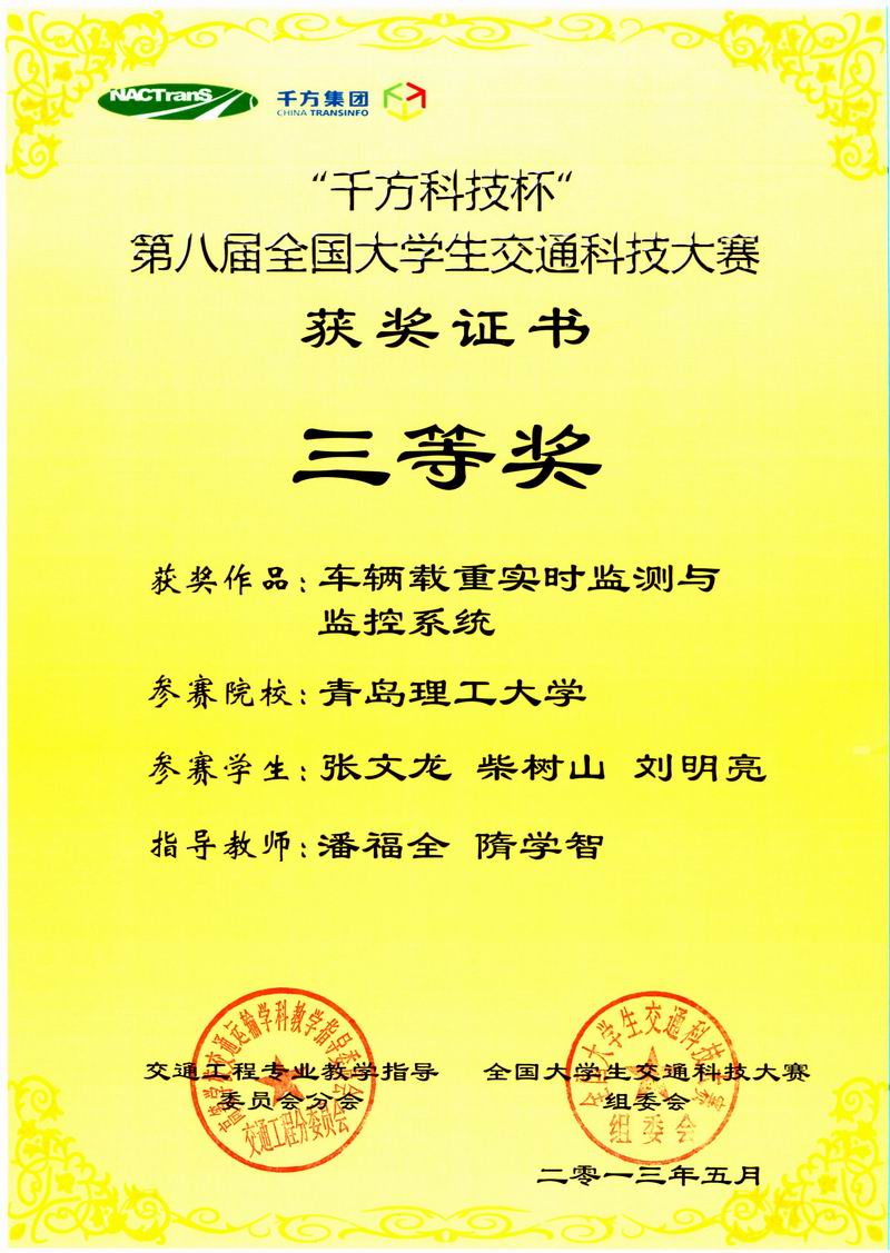 5月25日至26日,由教育部高等学校交通运输与工程学科教学指导委员会主办、北京工业大学承办,以“顺畅交通”为主题的第八届全国大学生交通科技大赛决赛在北京举行。本届大赛共有全国86所大学报名,198件作品参加选拔,经过专家组评审,仅有来自51所学校的80件作品进入决赛。今年会官网由潘福全、隋学智老师指导,张文龙、柴树山、刘明亮同学合作完成的《车辆载重实时监测与监控系统》荣获三等奖。