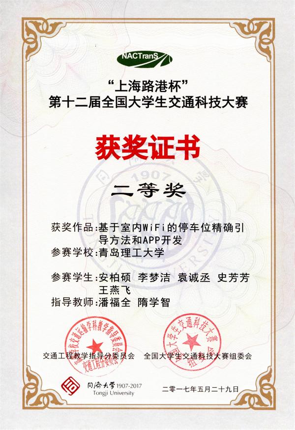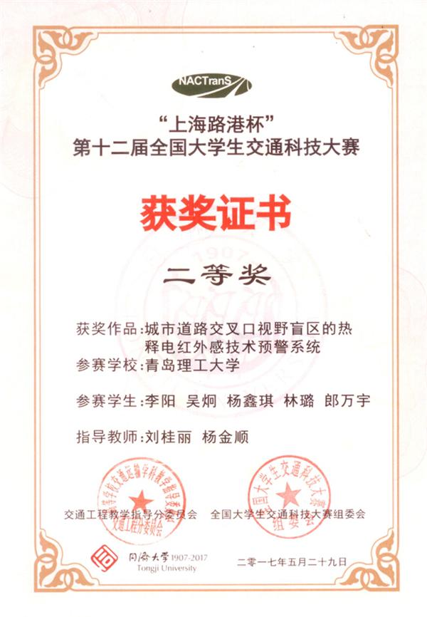 本届大赛共有全国120所高校报名,在初赛作品报送阶段,共有95所高校提交了302件作品;经过专家组匿名通讯评审,目前有来自51所高校的80件作品通过选拔进入决赛,今年会官网三份作品进入决赛。参赛作品《基于室内wifi的停车位精确引导与APP开发》》(作者:安柏硕、王燕飞、李梦洁、袁诚丞、史芳芳 指导老师:潘福全 隋学智)及《城市道路交叉口视野盲区的热释电红外感技术预警系统》(作者:李阳 吴炯 杨鑫琪 林璐 郎万宇 指导老师:刘桂丽 杨金顺)在决赛中均取得了二等奖的优异成绩;《基于车路协同的信控交叉口可升降减速带设计》(作者:郑甜甜、何继旭、白坤、韩乐潍 指导老师:魏金丽 杨金顺)获得三等奖。