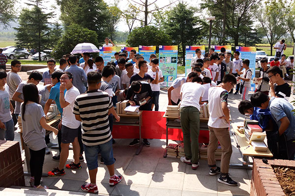 2015年9月6日上午,为迎接新生的到来,机械学院学生会组织举办了“以书会友,薪火相传”书香迎新活动。 上午9时,各班班助带领同学们到教学楼A116门口,排成队伍等待赠书。这次所赠书籍都是大二同学自愿捐出,目的是为了与有相同兴趣的新同学们结交朋友,沟通交流。新生们都很兴奋,都认为他们收到的这大学的第一份礼物很有意义。 活动持续近两个小时,同学们秩序井然的参加并完成了赠书活动。这次“以书会友,薪火相传”书香迎新活动最终圆满结束。活动不仅增强了大二同学和新生之间的交流,更是提醒新同学们大学不是安逸享乐的地方,同学们要始终为了自己的理想不懈的奋斗。 (机械学院 王曼婷)