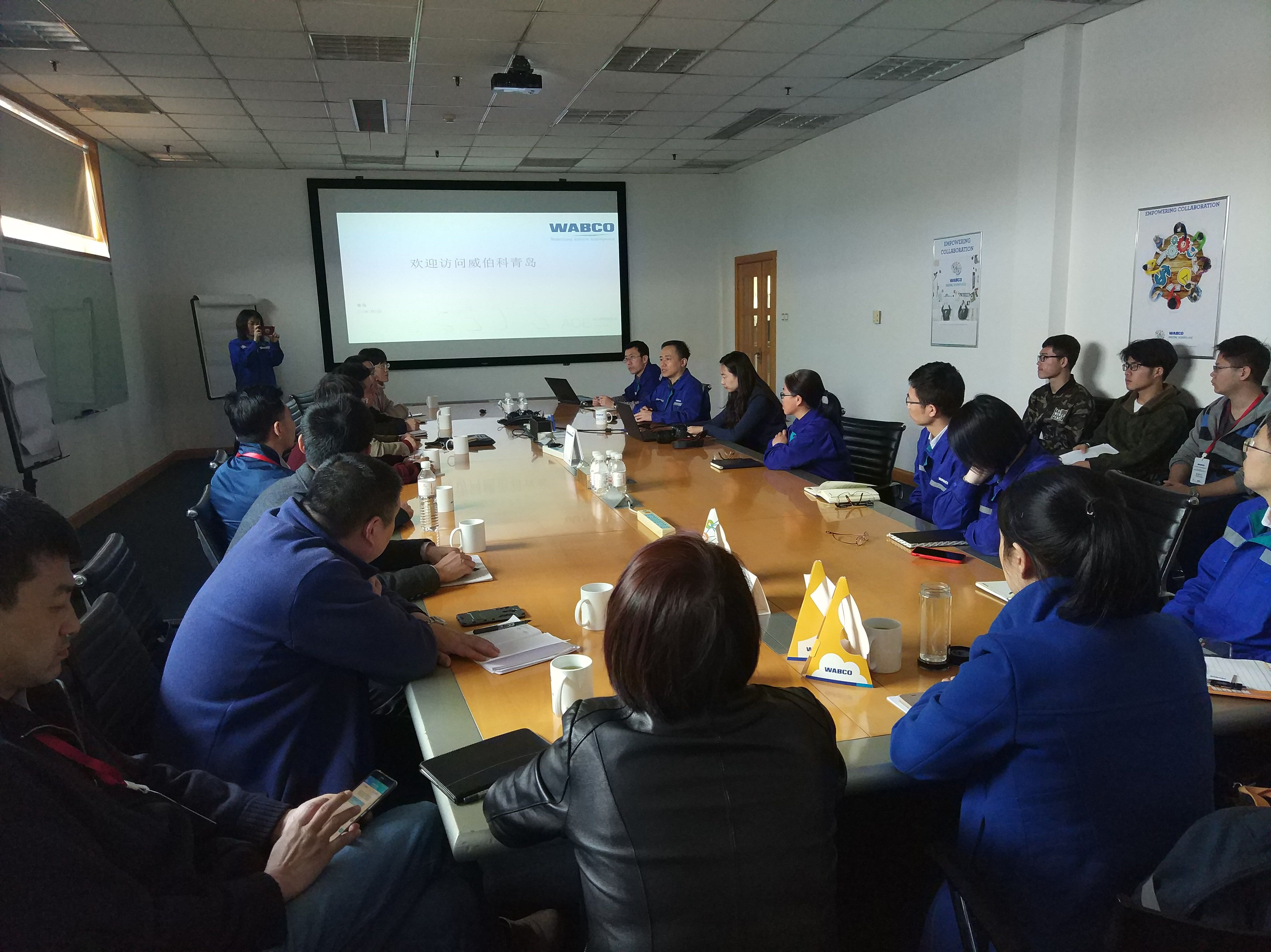 在威伯科汽车控制系统(中国)有限公司一号会议室,公司总经理王继才对机车学院老师的到来表示热烈的欢迎和期盼,希望与今年会官网进行长久的产学研合作。学院副院长杨勇教授表示自机车学院与威伯科签订校企合作后,学院立刻行动,切实将合作体现在行动上来。经前期沟通,这期带13位老师本着学习和解决企业难题的目的来企业交流,希望与威佰科的产学研能落到实处。随后王继才向大家介绍了公司的基本情况,威伯科汽车控制系统(中国)有限公司是由威伯科集团于2004年8月在中国青岛注册并投资1600万美元成立的亚太区独资的制造基地,是商用车电子制动、稳定性、悬挂和传动控制系统方面世界领先的供应商之一。公司期待在机械手在产线效率提升方面的应用、消音器测试、视觉检测稳定性(除噪)提升研究、能源回收及管控与今年会官网开展合作研发。随后机车学院刘志红博士向大家做了《汽车消音器声学性能测试评价》的学术报告。