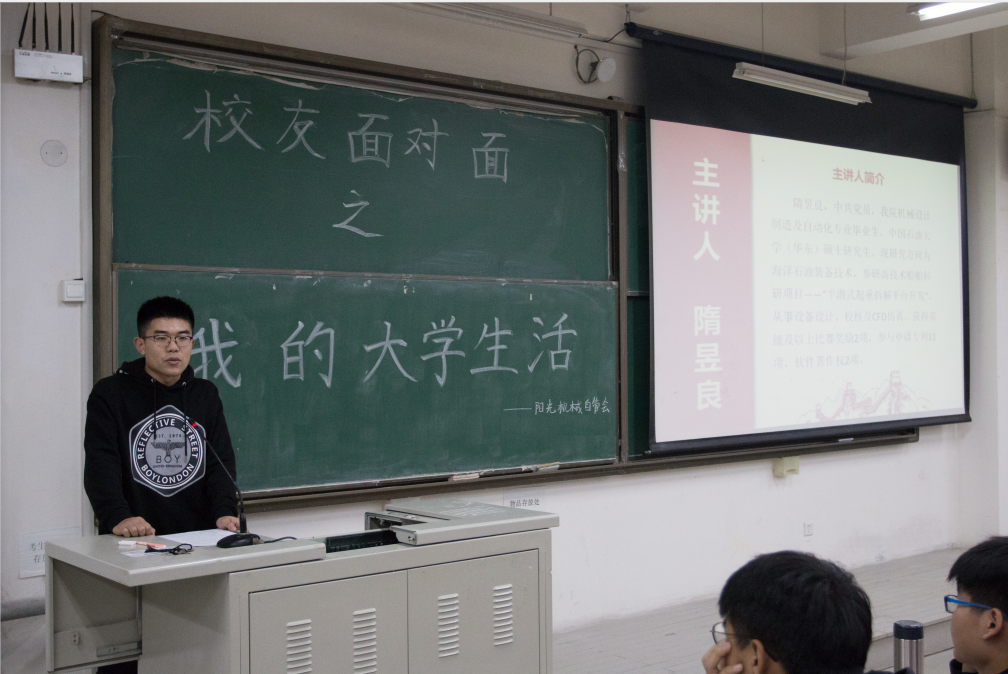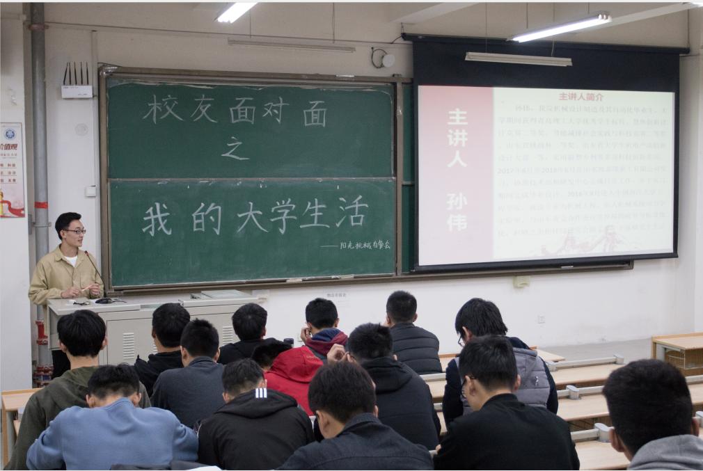 为更好的推进“精英培育计划”,促进学生学业、职业发展,助力学生实现梦想,11月24日下午,jinnianhui今年会在B135教室举办了以“我的大学生活“为主题的”卓越校友面对面“分享会。此次分享会由2014级校友隋昱良和孙伟主讲,2018级辅导员徐卫晓及200多名机械专业的学生参加此次分享会。
