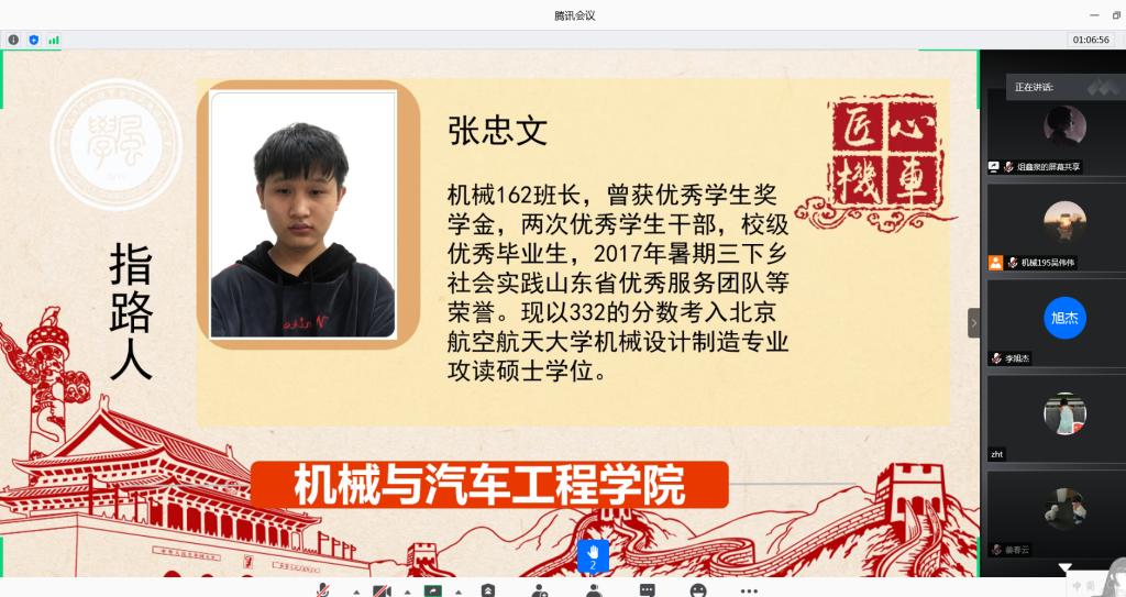 为进一步加强学院学风建设,提高广大同学的考研积极性和备考自信心,7月7日晚,jinnianhui今年会第31期匠心机车讲坛—“考研之路漫漫,前辈出招指南”在线上开展。本次交流会邀请了王鑫雨(山东大学研究生在读)、闫彩莲(东北大学)、张忠文(北京航空航天大学)和王俊博(山东大学)四位优秀的学长学姐进行线上交流分享,200余名学生参加此次交流会。
