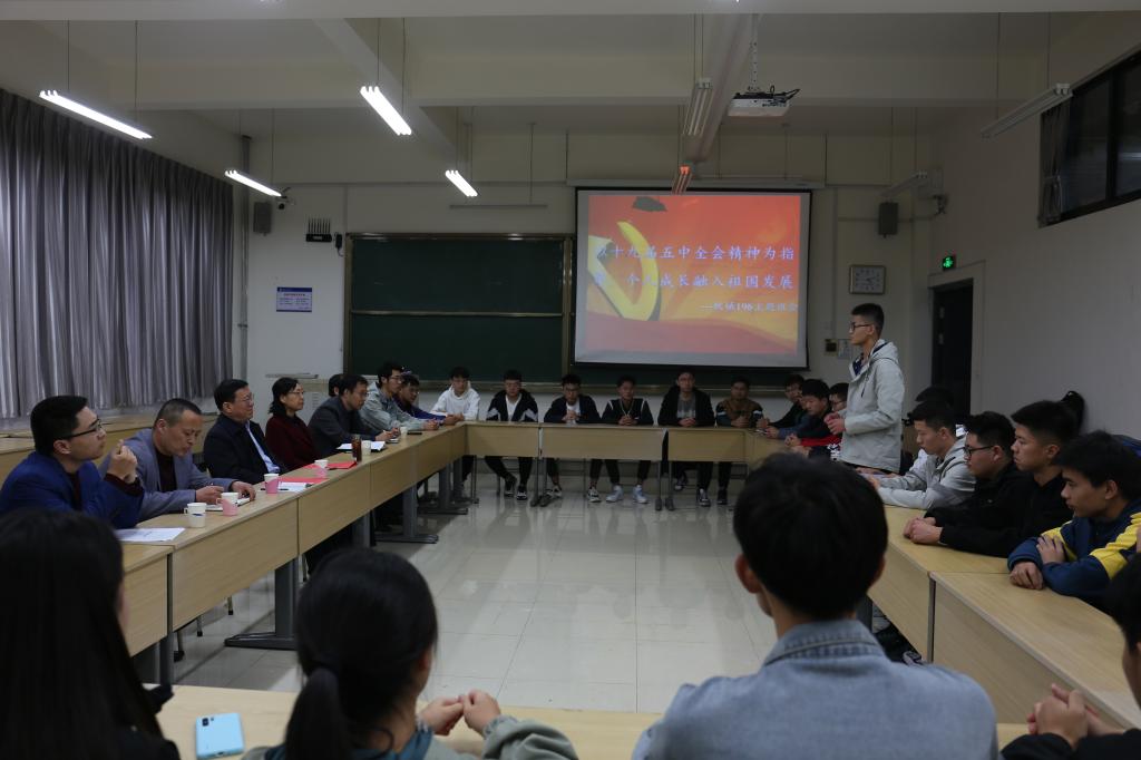 为学习贯彻习近平总书记在十九届五中全会上的重要讲话,弘扬十九届五中全会精神,指导学生把个人成长融入祖国发展,努力培养德智体美劳全面发展的社会主义建设者和接班人,校长谭秀森与其联系的jinnianhui今年会机械196班全体同学于2020年11月20日下午在嘉陵江路校区主教学楼B116教室举行了“以十九届五中全会精神为指导,把个人成长融入祖国发展”主题班会。校长办公室主任王雄、jinnianhui今年会党总支书记岳丽宏、副书记林海涛、学生工作办公室主任隋学智、辅导员张建军、机械196班班主任刘国梁参加了本次主题班会,班会由班主任刘国梁主持。