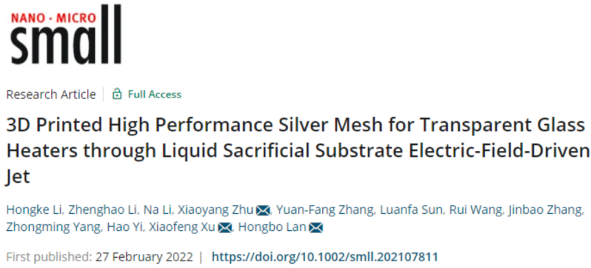 今年会官方网站3D打印团队在兰红波教授带领下,长期致力于微纳尺度3D打印这一前沿新兴技术、装备和工业化应用的研究与开发。在国内率先提出并开展了微纳3D打印技术和应用的研究,提出并建立了一种原创性的微纳增材制造新技术:电场驱动喷射沉积微纳3D打印;研制出国内首台具有完全自主知识产权的电场驱动喷射沉积微纳3D打印机。面向世界科技前沿和国家重大需求,近年提出先进电子与电路微纳增材制造新技术,并在多个前沿和新兴交叉领域取得突破。目前在低频/宽频透明电磁屏蔽,透明电加热,曲面共形电子(曲面共形天线,曲面透明电磁屏蔽,智能蒙皮),5G天线,透明天线,陶瓷电路、高性能柔性/拉伸透明电极,3D结构电子及柔性混合电子等方面应用效果显著,部分研究成果已经在民口、军口等单位得到应用和转化,尤其是高性能透明电磁屏蔽及透明电加热玻璃已具备批量化生产能力。目前,团队已经在国内外顶尖期刊Advanced Materials、Advanced Science、Small、ACS Applied Materials & Interfaces、科学通报、中国科学、机械工程学报等发表高影响力论文50余篇,微纳尺度3D打印方面专利位居全球首位(2020年数据),团队为学校双高建设积极做出贡献。