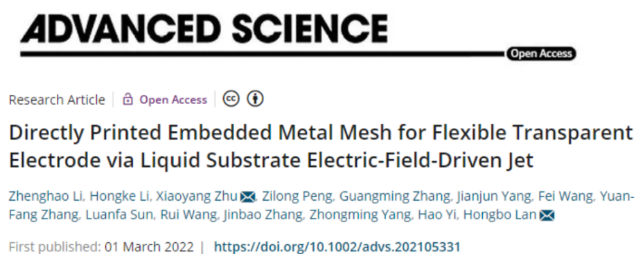 该系列研究成果聚焦于电场驱动喷射微纳3D打印技术及其在高性能透明电极制造中的应用研究:将电场驱动喷射微纳3D打印基底扩展至液态基底,研究了“双锥形”电场驱动喷射现象及液膜对打印材料“限制性”铺展作用,解决了厚膜导电浆料难以直接高分辨率印刷出可观高宽比金属网格、嵌入式金属网格透明电极难以直接打印成型等难题。同时,分别设计并制造了透明电加热玻璃、集成电热及光热的界面热蒸发器、电热驱动型透明4D打印结构、以及人体可穿戴的透明应变传感器,充分展示了所制造刚性及柔性金属网格透明电极的广泛应用潜能。