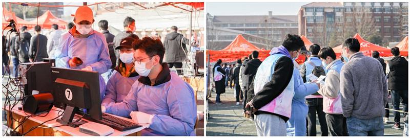 一轮轮的核酸检测,最大的考验是组织学生是否快速有序。核酸检测现场学生党员志愿者的服务为检测工作按下了“加速键”。“同学们不要急,请戴好口罩,按次序排队,不要拥挤”。活动现场,志愿者分工协作,耐心引导同学们有序排队,保持安全距离,协助核对受检人员身份信息,疏导学生分批进行检测,安抚同学们情绪,坚持做好每一个细节。研究生第一党支部李俊皓在一轮轮核酸检测的志愿服务工作中摸索出经验和窍门,为了控制好核酸检测现场节奏,他将现场的党员志愿者与班级负责人结对,通过一对一线上沟通,实时提醒现场进度,确保参加检测班级既能按时到达现场,又不会造成现场的拥堵,大大提高了核酸检测效率。