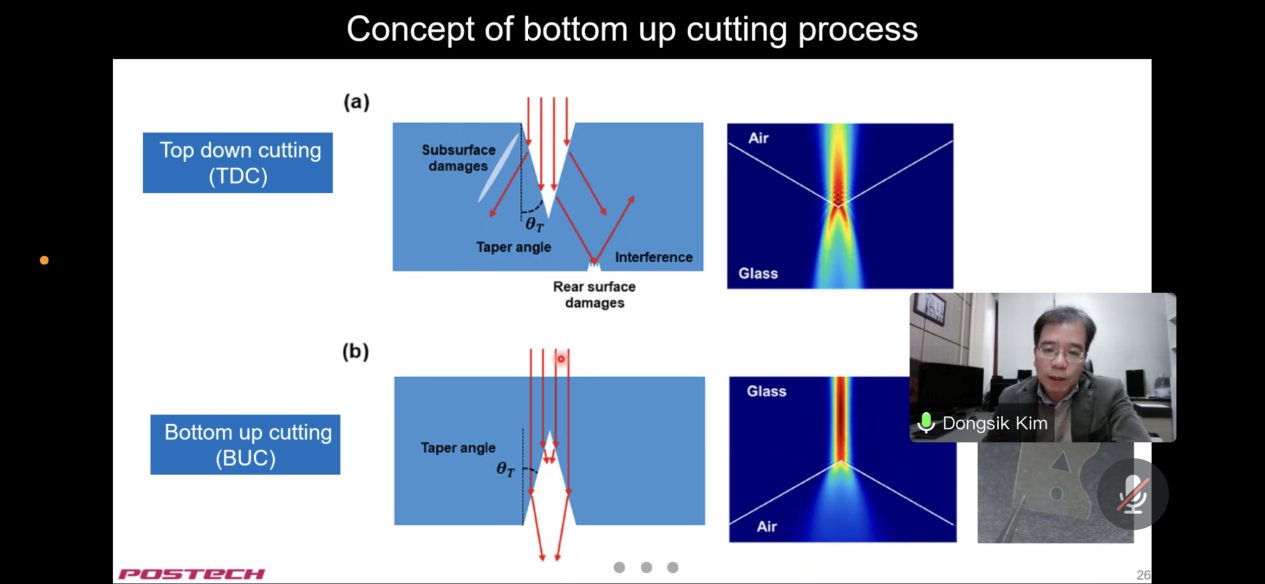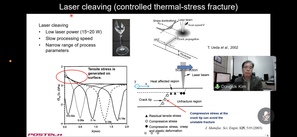 Dongsik Kim教授在讲座中介绍了激光制造技术在柔性器件制造方面的最新进展。讲座的第一部分介绍了三种不同的激光切割工艺来分离超薄玻璃板,重点是优化激光切割样品边缘强度。在超薄玻璃飞秒激光烧蚀切割中,得到了最大限度提高边缘强度的最佳条件。同时,提出了一种新的烧蚀切削方法最后,优化了飞秒激光贝塞尔光束的激光内刻划工艺。在第二部分中,介绍了激光冲击压缩烧结/嵌入银纳米颗粒的方法。脉冲激光烧蚀产生的局部高压冲击使制造嵌入在柔性基板和基板表面的银电极成为可能。