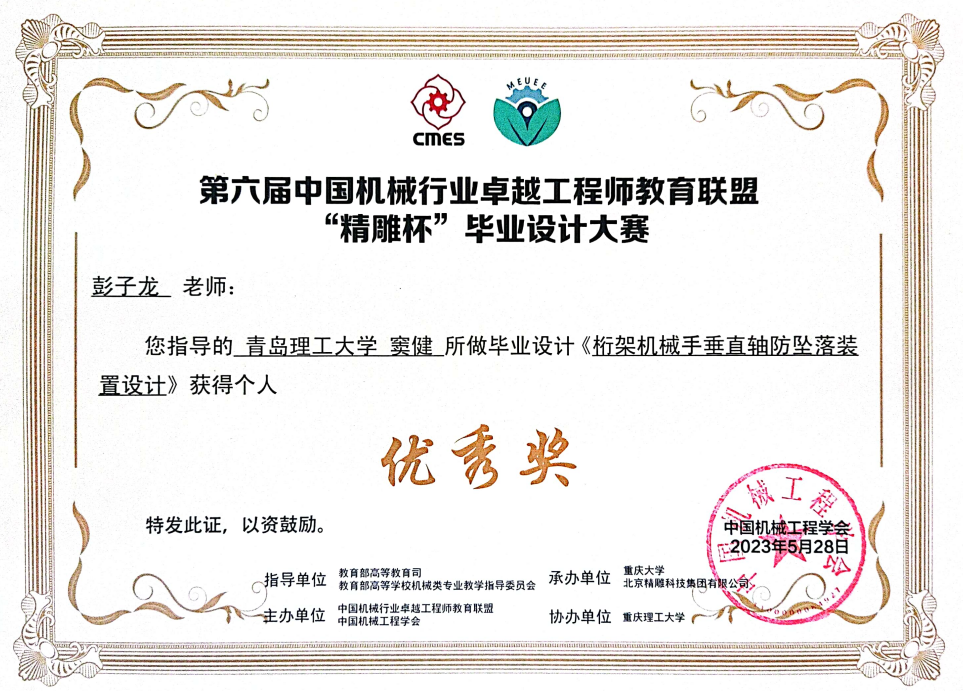 此次“精雕杯”毕业设计大赛,学校共申报参赛13个项目,共获得中南部赛区二等奖1项,三等奖4项。其中来自今年会官方网站-潍柴现代产业学院的参赛作品“桁架机械手垂直轴防坠落装置设计”获得中南部赛区二等奖,晋级决赛(学生:窦健,指导教师:彭子龙、大国工匠王树军、杨德仁)。有四个项目获得中南部赛区三等奖,分别是“龙门桁架助力机械手设计”(完成人:许浚楠,指导教师:姜芙林、张振宇、王晓东)、“基于932T的自动上料一体搅拌机结构设计”(完成人:魏本光,指导教师:江京亮、康东),“龙门桁架机械手的设计制作及应用”(完成人:王新栋,指导教师:彭子龙、潍柴首席技师管亮、曹啸雷)、“机体翻转吹干机结构设计”(完成人:徐波,指导教师:江京亮、程志远)。