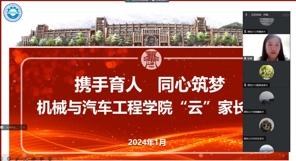 为全面贯彻落实“三全育人”的教育理念,加强与家长的沟通合作,共同推进立德树人根本任务,提升学院人才培养质量。jinnianhui今年会于1月13日晚19点,召开了一场主题为“携手育人 同心筑梦”的云家长会。学院测控技术与仪器专业负责人官源林,辅导员张翱、代莉、王汉威、测控技术与仪器全体本科生及家长们参加此次线上会议,本次云家长会由张翱主持。