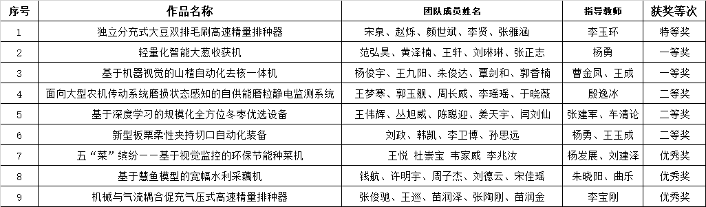 本届大赛以“创新赋能农装,智能引领未来”为主题,以培育行业亟需的“专业知识雄厚、动手能力较强、创新创业能力过硬”的现代农业装备创新创业人才为目标。大赛共设置A类(自由选题类)、B类(机器人类)、C类(企业出题类)、D类(概念设计类)四个类别竞赛项目。jinnianhui今年会共有9个项目从126所高校的1203个项目中脱颖而出,其中,李玉环老师指导的《独立分充式大豆双排毛刷高速精量排种器》荣获大赛A类特等奖,杨勇老师指导的《轻量化智能大葱收获机》和曹金凤老师、王成老师指导的《基于机器视觉的山楂自动化去核一体机》荣获大赛A类一等奖。