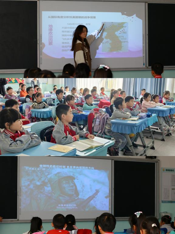 活动在抗美援朝的纪录短片中拉开序幕,学生鲁又琪从抗美援朝的战争背景、过程、重大战役及时代意义等方面和在场的小学生进行了宣讲交流。通过观看视频、互动启发、课堂讨论等形式将学生们带回到了那个战火纷飞的年代。在 “抗美援朝”知识问答环节,小学生积极参与,踊跃作答,巩固了重要历史知识。吴蒙蒙以电影《志愿军:存亡之战》中一颗糖的故事引发大家对当今幸福生活的思考,孩子们纷纷在纸上写下自己想对先烈说的话,纷纷表示要铭记历史,争做新时代好少年,为祖国强盛贡献自己的力量。