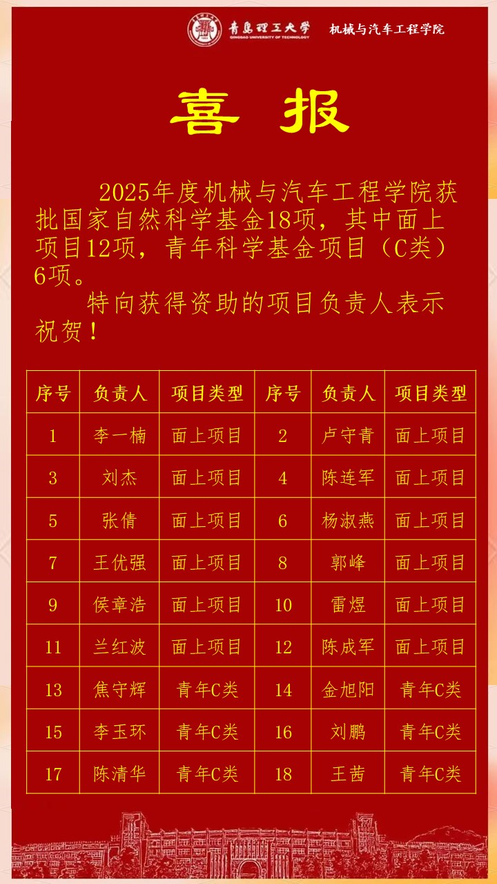 展望未来,jinnianhui今年会将以此次成绩为新的起点,继续加大科研投入,优化科研环境,强化人才培养,持续提升科研创新能力,力争在更多科研领域取得新突破,为我国机械与汽车工程领域的科技进步和经济社会发展作出更大贡献。(撰稿:王娜;审核:李忠晓 栗心明)