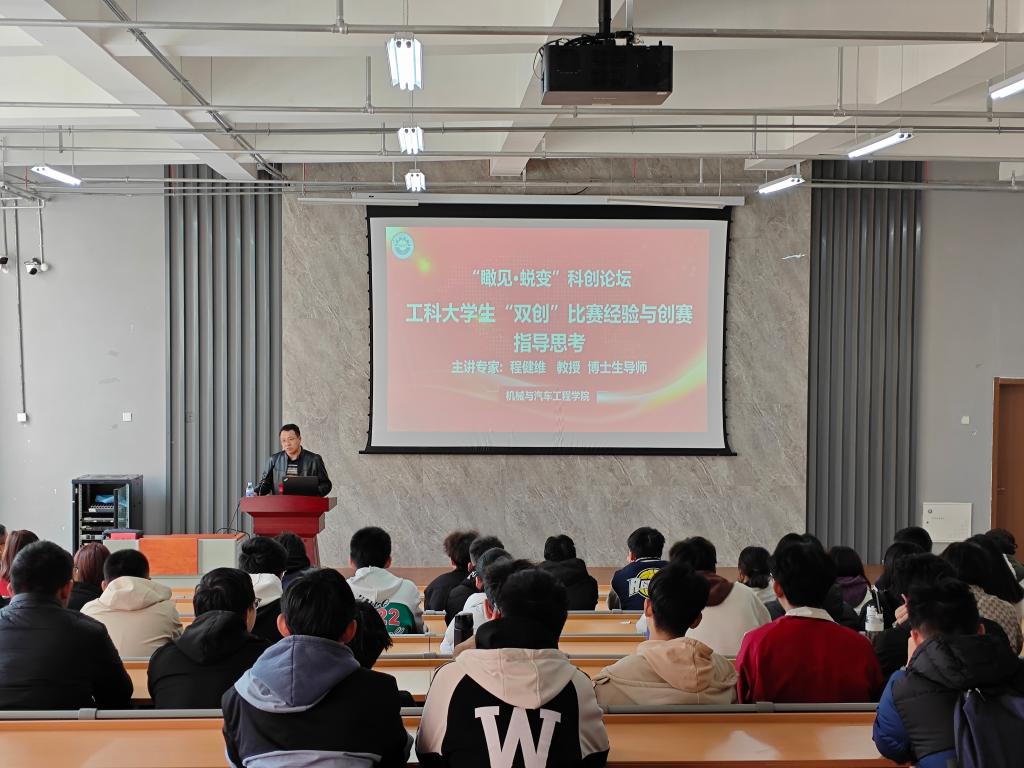讲座中,程教授结合自身丰富的指导经验,围绕“双创”赛事三大核心环节——选题方向、项目打磨与答辩技巧展开系统讲解。他分享了“立足专业、聚焦痛点”的选题思路,深入解析大赛中研究报告的逻辑构建与视觉呈现方法,并通过实际案例生动剖析答辩中的常见误区及应对策略。程教授特别指出,“双创”项目应兼具“技术创新性”与“落地可行性”,鼓励学生将专业知识与产业实际需求相结合,在实践中锤炼“从问题到方案”的闭环思维能力。