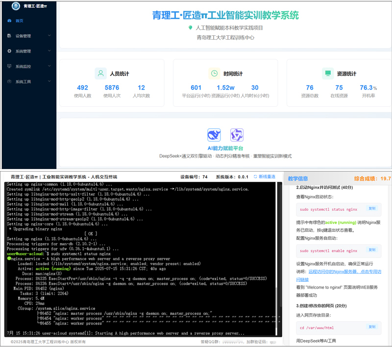 本学期初,学院正式启动工程训练中心数智化转型重点项目——“青理工·匠造π”,着力构建融合前沿AI技术的实践教学新范式。为突破传统实训教学条件的局限性,学院依托自有IT技术团队,自主研发了基于大语言模型的智能化实训教学系统,为工科学生打造了沉浸式、强互动的AI应用实践环境。该项目首期成果“工业智能A”综合实训项目,聚焦AI编程与工业大数据可视化两大核心技能,有效贯通了从理论学习到动手实践的链路,助力学生了解并掌握运用先进工具进行工业数据获取、处理分析及可视化呈现的关键基础能力。