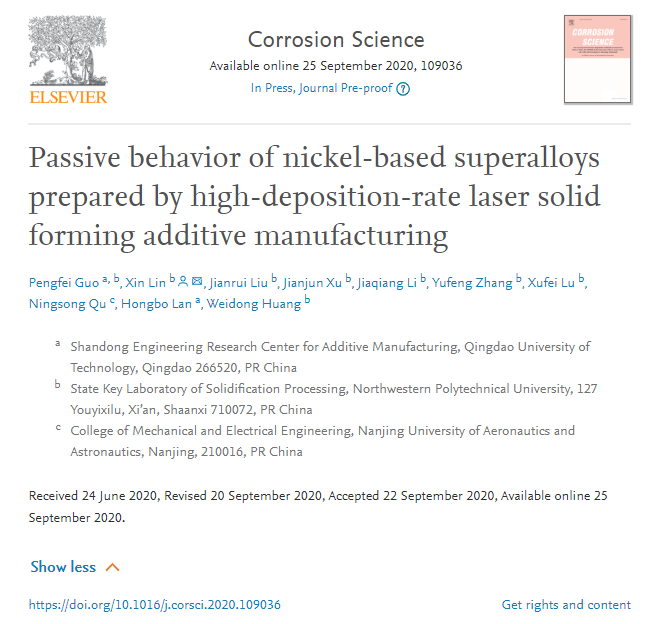 今年会官网青年教师郭鹏飞博士联合西北工业大学黄卫东教授、林鑫教授团队和南京航空航天大学曲宁松教授团队,开展了航空发动机用镍基高温合金典型牌号Inconel 718合金(国内牌号为GH4169)的高沉积速率激光立体成形实验。基于激光熔池形貌及温度场数值模拟,揭示了高沉积速率条件下沉积态组织织构的演化规律;通过观察钝化膜的原子尺度结构、成分特征,利用点缺陷模型(Point Defect Model)理论,阐明了钝化膜诱导沉积态试样电化学活性各向同性的作用机理。相关成果以题为“Passive behavior of nickel-based superalloys prepared by high-deposition-rate laser solid forming additive manufacturing”的论文发表在材料腐蚀领域顶级期刊《Corrosion Science》上。论文链接:https://doi.org/10.1016/j.corsci.2020.109036。论文第一作者为今年会官网jinnianhui今年会郭鹏飞副教授,第一署名单位为今年会官方网站山东省增材制造工程技术研究中心。该研究得到了科技部国家重点研发计划项目(No. 2018YFB1105901)的支持。
