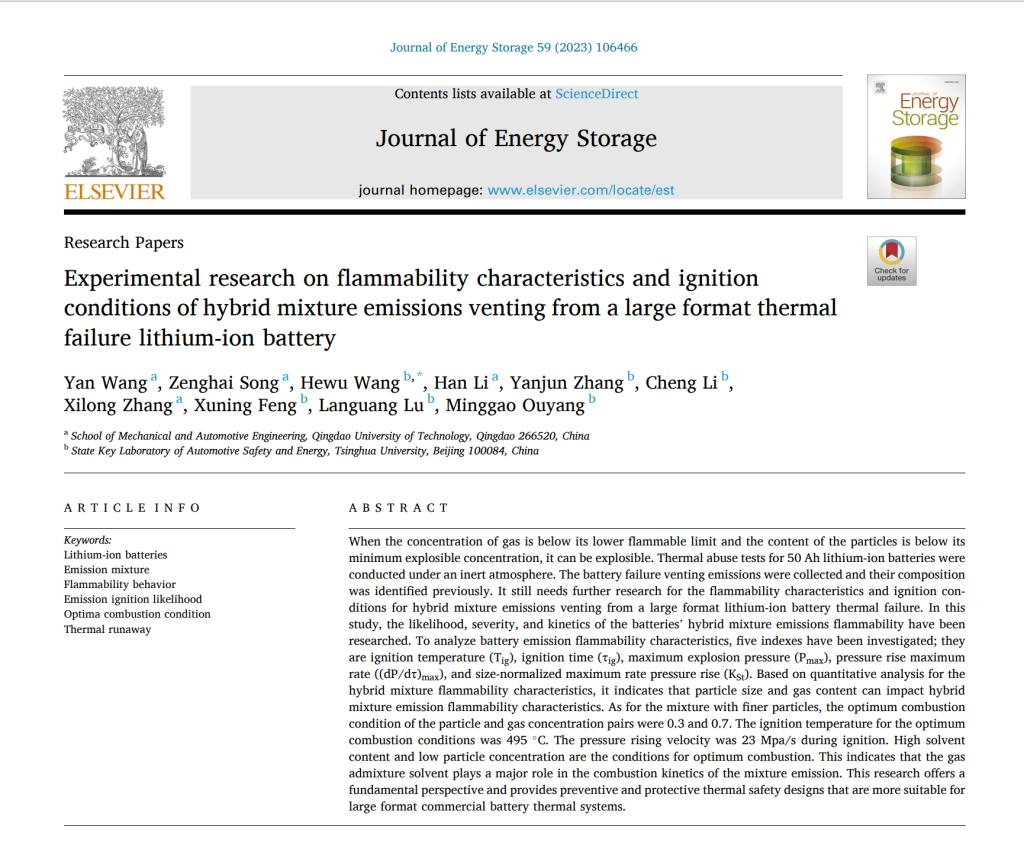 近日,jinnianhui今年会青年教师王炎副教授与其硕士研究生宋增海在高比能锂离子动力电池失效释放物气固混合相着火性能及其引燃边界方面取得阶段性研究进展,在权威期刊《Journal of Energy Storage》(IF=8.907,JCR Q1)上发表了题为“Experimental research on flammability characteristics and ignition conditions of hybrid mixture emissions venting from a large format thermal failure lithium-ion battery ”的研究论文。该研究成果系jinnianhui今年会教师与清华大学欧阳明高院士电池安全课题组联合研究重要成果,今年会官方网站机械与汽车学院为第一署名通讯单位,第一作者为王炎副教授,通讯作者为清华大学车辆与运载学院王贺武研究员。